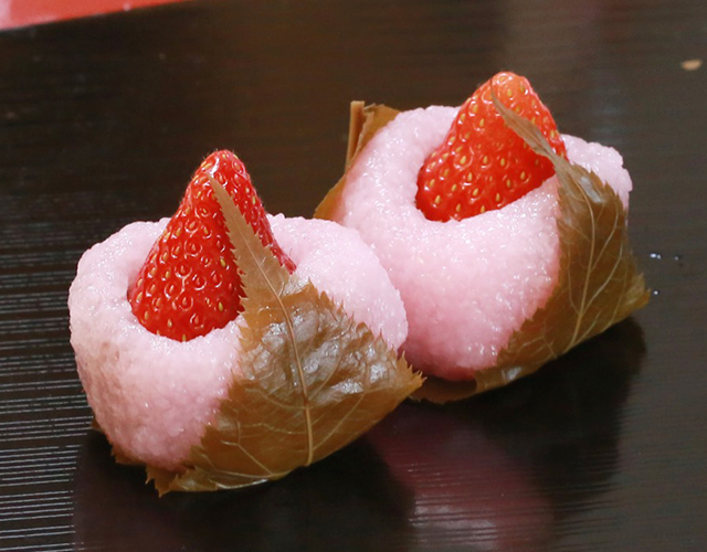 近江屋自慢の自家製こしあんが包まれた桜餅に、大粒のいちごを合わせました。