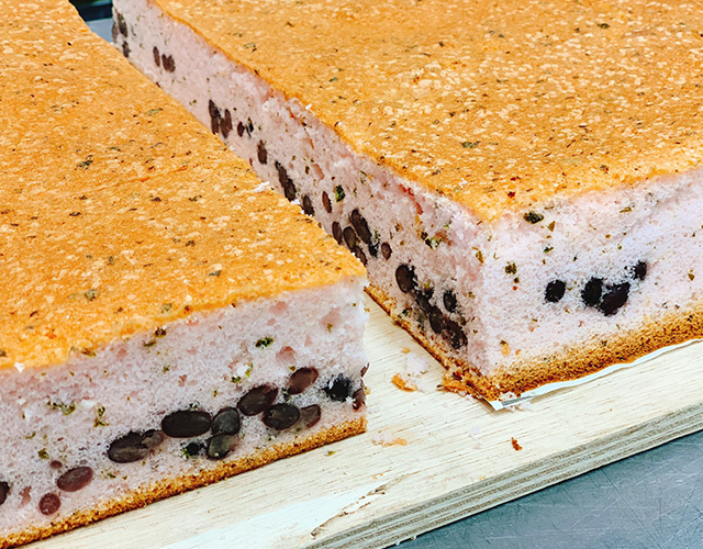 桜の葉と小豆を生地に練り込んだカステラです。ほんのり塩味が効いています。