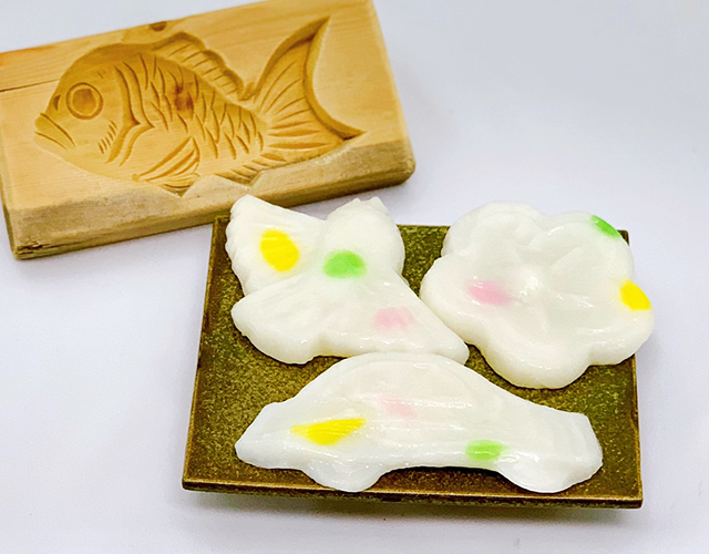 熱湯でこねた米粉を木型に入れて成型し、蒸し器で蒸しあげます。